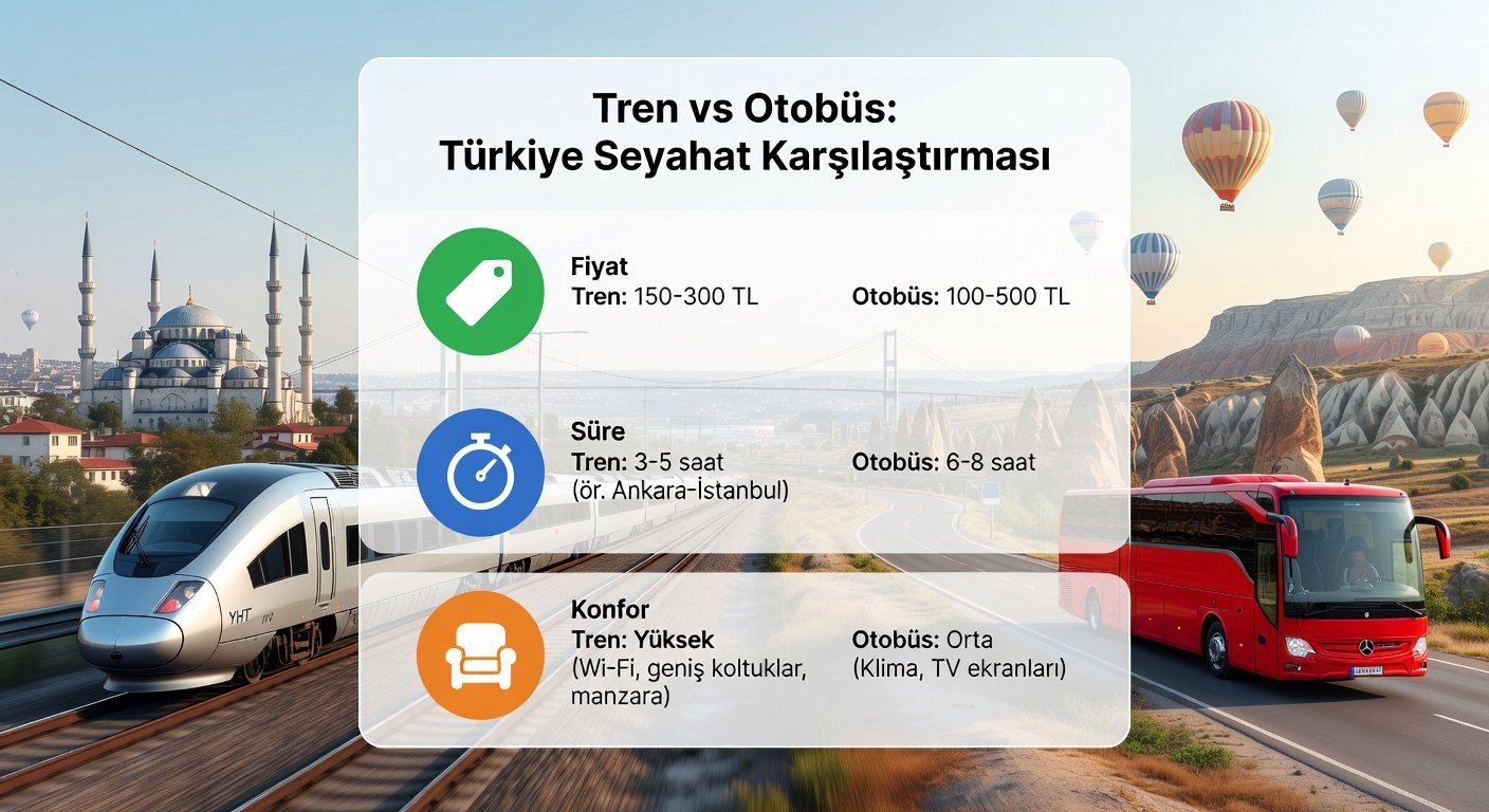 İstanbul-Ankara Rotası: Tren (YHT): 3,5 saat, 250 TL, yüksek konfor. Otobüs: 5 saat, 300 TL, orta konfor. Tren, iş seyahatleri için ideal; otobüs ise bütçe odaklı.