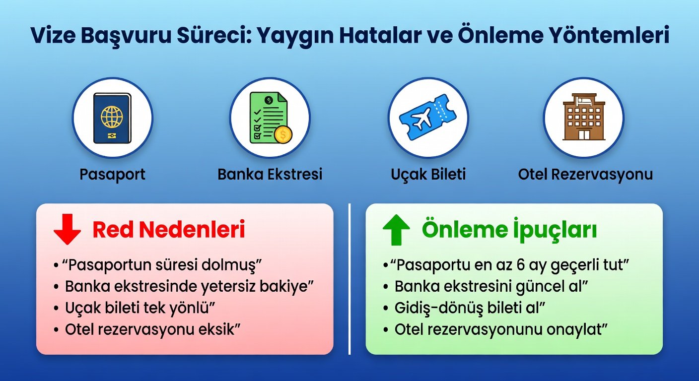 Türkiye'ye seyahat etmek isteyen turistler için vize başvurusu, heyecan verici bir maceranın ilk adımıdır. Ancak, ne yazık ki birçok başvuru redle sonuçlanıyor. Bu makalede, Türkiye vizesi başvurularında en sık rastlanan red nedenlerini listeleyeceğiz ve her biri için turist vizesi giriş kuralları ile seyahat belgeleri odaklı önleme yollarını açıklayacağız. Ayrıca, başvurunuzu güçlendirecek pratik ipuçları, 2026'daki olası güncellemeler ve başarılı başvuru örneklerini paylaşacağız. Bu bilgilerle, vize sürecinizi daha sorunsuz hale getirebilirsiniz.